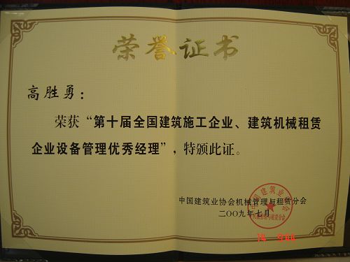 近日,工程设备技术公司被中国建筑业协会机械管理与租赁分会,评为“第十届全国建筑施工企业、建筑机械租赁企业设备管理优秀单位”。公司经理高胜勇同志被评为第十届全国建筑施工企业、建筑机械租赁企业设备管理优秀经理。150吨履带吊司机孟凡军同志被评为第十届全国建筑施工企业、建筑机械租赁企业设备管理优秀工人。
