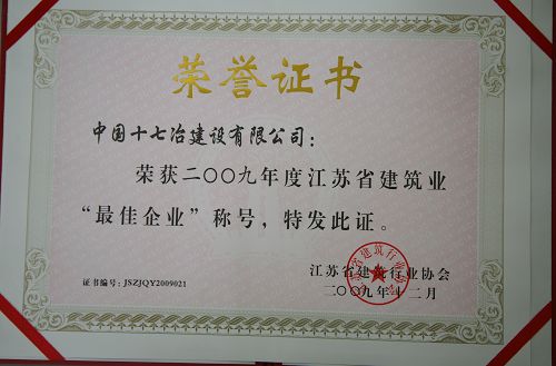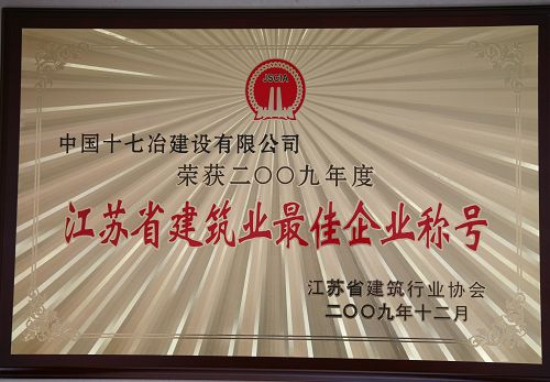 近日,江苏省建筑行业协会经过对我公司施工力量、施工业绩和信誉等方面的审查后,授予我公司“江苏省2009年度建筑业最佳企业称号,并颁发了荣誉证书和奖牌。