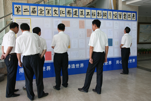 为了提高员工格言的宣传效果,第二届企业文化节组委会从征集的格言中选出400余条,通过硬笔书法这一员工喜闻乐见的艺术形式予以展出,把内容与形式、精神与物质有机结合,给格言以硬笔书法的美感,给予智慧以灵动。连日来,观赏的员工络绎不绝,从中再一次接受到企业文化理念的熏陶。