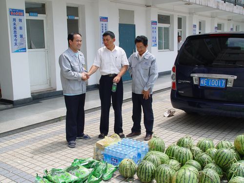 78上午,公司工会副主席韩伟群等同志受公司领导的委托,来到装备制造公司、工程技术服务公司、十七冶动迁房项目部、金安小区保障性住房项目部和金福花园保障性住房项目部等单位,为基层员工们送上茶叶、西瓜、矿泉水以及十滴水、人丹、清凉油、藿香正气水等防暑降温药品,带来公司领导对奋战在高温一线的广大员工诚挚的问候,员工送去清凉。