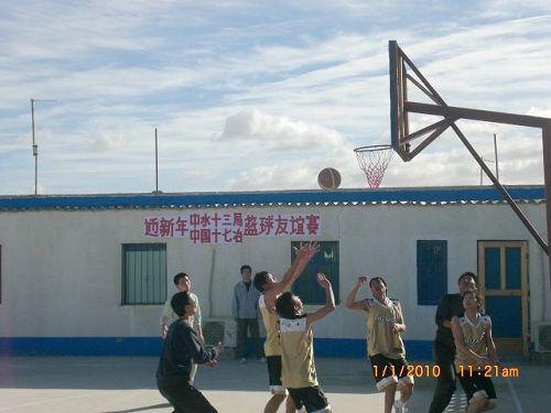 新年伊始,一场别开生面的篮球比赛在十七冶阿尔及利亚BOUSAADA监狱工程项目经理部简易的半边球场上正进行着。场上小伙子们生龙活虎的激烈争夺,抢、传、运,投篮,“好球!好球!”,双方观战领导和啦啦队为场上球员们的精彩表现发出阵阵欢呼。这是迎新年中国十七冶和中水电十三局举行的篮球友谊赛。