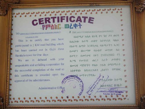 “赠人玫瑰,手有余香”。项目部传承中国传统文化中的真诚与付出,“融入当地,造福民众”。当埃塞项目部了解到哈纳克罗镇政府沿街有一条1公里的环形道路需要改造时,项目部无偿派出施工设备与员工,顺利完成其道路改造工程。哈纳克罗镇政府和沿街民众为了表达真诚的谢意,特别制作了镶了木框的荣誉证书送到我项目部,以做永久珍藏和留念。