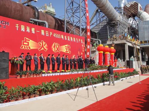 118上午10时,由水泥工程技术公司承建的宝鸡市千阳县海螺一期4500t/d熟料水泥生产线顺利点火投产,陕西省人大常委会原代主任崔林涛、省政协副主席张生朝、宝鸡市市委副书记戴征社、陕甘区主任陈永波、海螺集团副董事长李顺安、千阳海螺总经理兰泽军等领导出席点火仪式,十七冶水泥工程技术公司副经理胡文奎参加了典礼。