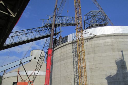 总长455m的石灰石下山廊道、原料入磨廊道、生料入库廊道和熟料入库廊道能否如期贯通,关系到该工程的总体交安节点。其最大难点属熟料入库廊道斜拉链钢桁架施工,桁架重78吨,顶部支座高42.5m,吊装难度大。为确保工程主体全部顺利交安,水泥工程技术公司副经理韦俊春亲临现场组织,积极与业主沟通,促使工程施工顺利进行,向业主公司交了一份满意的答卷,为实现710点火投产奠定了基础。