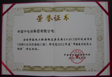 日前,由中国十七冶集团风力与太阳能发电工程技术公司承建的甘肃瓜州300 MW大型自主化示范风电工程和安徽龙源来安4×49.5MW风电工程获得2012年度中国电力优质工程奖。