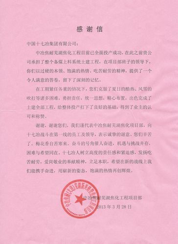 中冶焦耐芜湖焦化工程项目部向我公司致感谢信