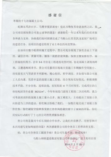 该项目合作虽结束了,但十七冶人所践行“诚信社会为本、客户满意为荣”的经营理念和“高效严谨、精细务实”的企业作风给客户留下了深刻印象。感谢信中,该项目部真诚希望与我们长期并肩携手,用智慧和汗水共同谱写诗城更加绚丽的诗篇,这也正是“让用户永远感念你”的真实写照。