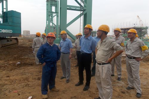 正在建设中的湛江钢铁炼钢工地经受住了今年第十五号 “海鸥”强台风的横扫侵虐。台风刚刚过后,整个施工工地又恢复了热火朝天的施工繁忙景象,钟华彪经理陪同戴志浩总经理一行,实地查看建设工地每一处,他详细地向宝钢公司各位领导汇报了台风过后工程在土建、钢结构安装建设进展情况及后续工程施工整体部署。现场钢结构工程成品保护,制作安装的进度、质量、标化工地建设推进及后续工程安排等方面得到了宝钢领导们的充分认可。检查组希望项目部继续保持良好的工作状态,全力以赴,干好在建工程。