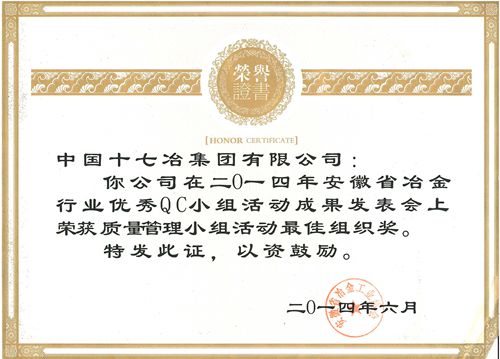 近日,从安徽省冶金工业协会获悉,中国十七冶集团荣获质量管理小组活动最佳组织奖和42014年安徽省冶金行业优秀QC小组活动成果二等奖。