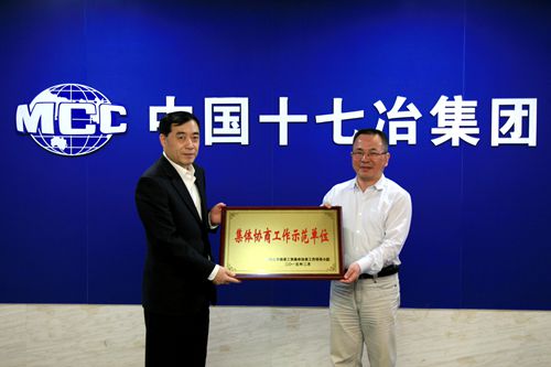 55下午,马鞍山市政协副主席王青松、总工会副主席晏琢一行到中国十七冶集团,为公司颁发马鞍山市“集体协商工作示范单位”奖牌,公司副总经理蔡进代表公司接受了奖牌。