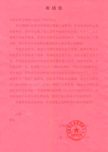 日前,宝钢湛江钢铁炼钢厂向中国十七冶集团冶金工程技术公司宝钢湛江炼钢工程项目部发来表扬信,对他们顺利完成各项目工期目标表示赞扬和感谢。