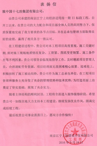 5月18日,南京上坊建设开发有限公司向中国十七冶集团发来表扬信,表扬十七冶南京分公司在上坊片区经济适用房一期II标段的施工中奋勇争先,保质保量完成了各节点目标,并在管理方面取得了良好业绩。