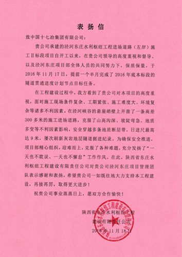 11月18日,陕西省东庄水利枢纽工程建设有限责任公司向中国十七冶集团发来表扬信,表扬十七冶交通工程技术公司泾河东庄水利枢纽工程道路Ⅱ标段项目经理部为优质高效推进工程建设,提前完成标节点目标所作出的努力。