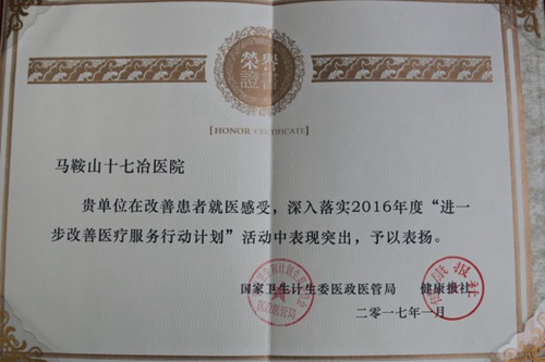 十七冶医院秉持“救死扶伤、患者至上”的办院宗旨,通过改善环境、优化流程、提升质量、保障安全、促进沟通、建立机制、科技支撑等措施,实现人民群众便捷就医、安全就医、有效就医、明白就医,促进医疗服务水平明显提升,人民群众看病就医感受明显改善,社会满意度明显提高,成绩显著,获得主办方肯定而获奖。