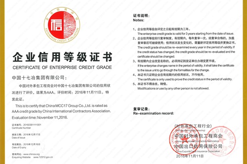 12月20日,中国十七冶集团收到对外承包工程商会和中国出口信用保险公司颁发的AAA企业信用等级证书和牌匾,被评为2016年对外承包工程企业最高信用等级AAA级企业。