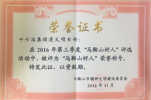 12月22日,从马鞍山市精神文明建设委员会传来喜讯,中国十七冶集团交通工程技术公司贵州遵义项目部集体荣获2016年三季度“马鞍山好人”荣誉称号。