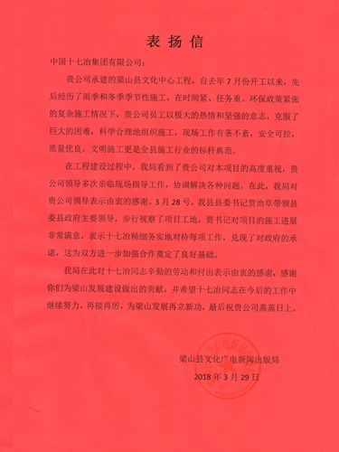 3月30日,中国十七冶集团收到业主梁山县文化广电新闻出版局的表扬信,对山东分公司梁山县文化中心工程项目经理部员工在梁山文化中心项目建设中,勇于面对各种困难、精心策划、真抓实干,确保各项关键节点进行表扬。
