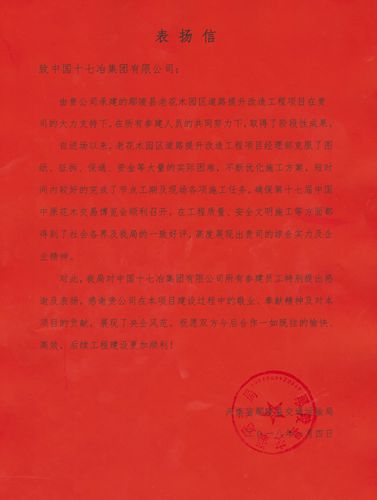 1月4日,河南省鄢陵县交通运输局向中国十七冶集团发来表扬信,对中国十七冶集团有限公司交通工程技术分公司鄢陵县老花木园区道路提升改造工程项目部在项目建设过程中的敬业、奉献精神及所做出的贡献表示感谢。