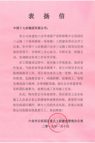 1月17日,六安市示范园区重点工程建设管理办公室向中国十七冶集团有限公司发来表扬信,对中国十七冶集团路桥工程技术分公司六安三元路项目部积极推动工作有序开展、按期完成施工任务提出表扬。
