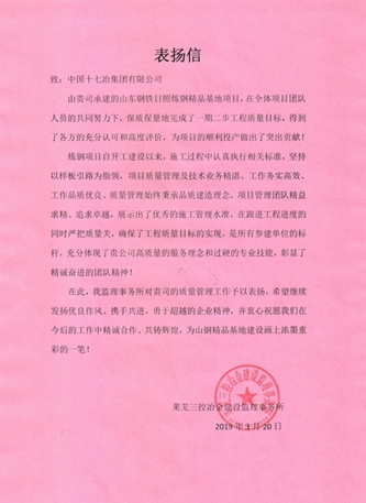 327日,中国十七冶集团有限公司收到山钢日照炼钢项目监理单位莱芜三控冶金建设监理事务所发来的表扬信。
