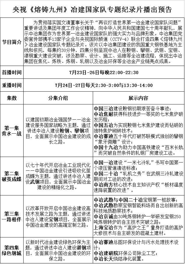为贯彻落实国文清董事长关于“再谈打造世界第一冶金建设国家队问题”重要讲话精神及集团年度工作会议精神,向中华人民共和国建国七十周年献礼,展示中冶集团作为世界第一冶金建设国家队的强大实力与品牌形象。中冶集团党委宣传部携手13家子企业与央视国际频道(CCTV-4)联合打造四集《熔铸九州》冶金建设国家队专题纪录片。7月23日-26日每晚22:00-22:30首次播出,次日2:30-3:00与13:30-14:00两个时间段重复播出。