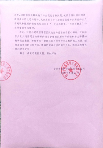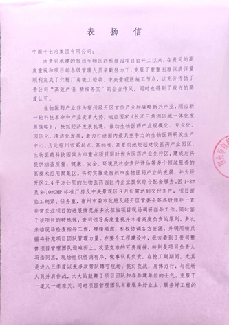 8月23日,宿州市创投公司向中国十七冶集团致表扬信,对房屋工程技术分公司在宿州生物医药科技园项目上所的贡献给予了高度赞扬。