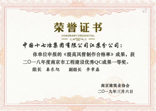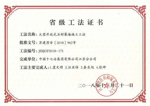 9月5日,中国十七冶集团江苏分公司先后收到江苏省住房和城乡建设厅及南京建筑业协会发来的获奖证书,“大型开放式石材幕墙施工工法”被评为江苏省省级工法“提高风管制作合格率”成果被评为南京市工程建设优秀QC成果一等奖。