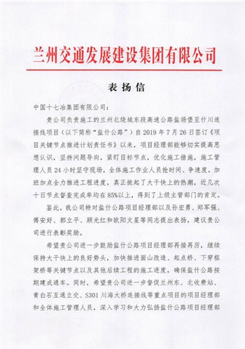 9月9日,兰州交通发展建设集团有限公司向中国十七冶集团有限公司发来表扬信,对十七冶公路分公司承建的兰州盐什公路项目的突出表现给予肯定与表扬。