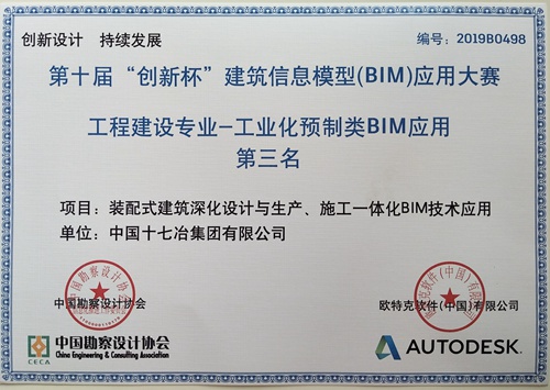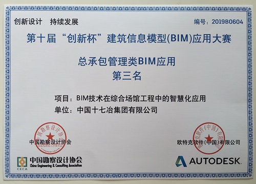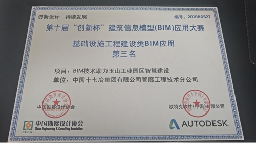 99日,中国勘察设计协会在珠海召开了全国第十届“创新杯”建筑信息模型(BIM)应用大赛优秀作品发布交流会。会上,中国十七冶集团有限公司城建分公司滁州科创城文体中心项目、合肥毓秀雅苑项目分别荣获总承包管理类第三名和工业化预制类BIM应用第三名,管廊分公司玉山县标准化厂房项目部获基础设施工程建设类BIM应用第三名