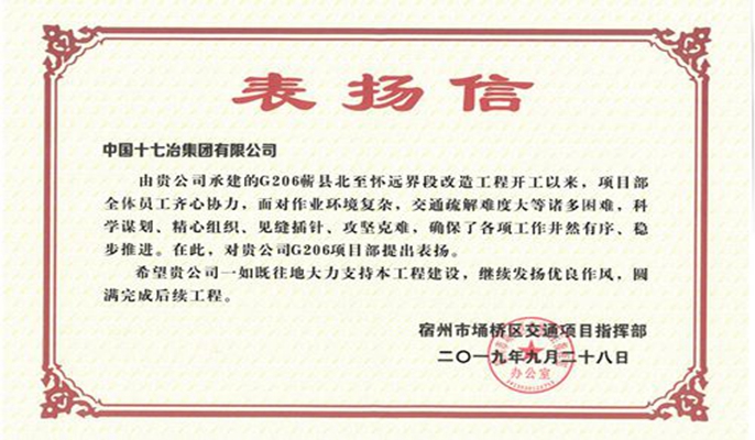 109日,中国十七冶收到宿州市埇桥区交通局项目指挥部发来的表扬信,路桥工程技术分公司宿州G206蕲县北至怀远界段改造工程项目部攻坚克难,顺利完成任务进行了表扬。