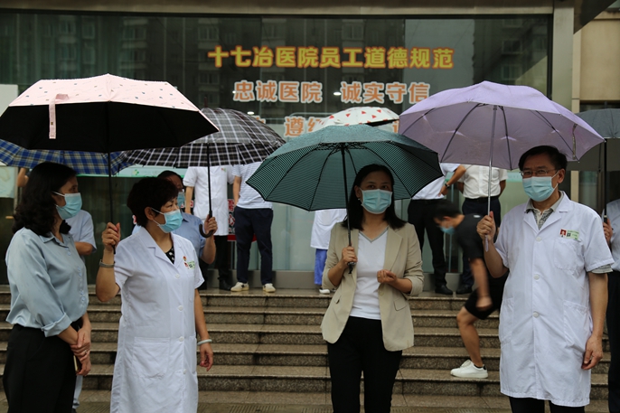 阚青鹤副市长仔细询问了医院近期疫情防控工作进展情况、防疫部署计划、安全生产工作等,对十七冶医院疫情防控与安全生产工作给予充分肯定。她要求,要坚持底线思维,高度重视疫情防控工作,紧盯薄弱环节,切实增强责任意识和大局意识,做到疫情防控闭环管理,做好环境清洁消毒,严防院内感染,完善疫情防控救治方案和应急流程,不断提升常态化疫情防控与应急处置能力;加大检查督促力度,教育引导群众不扎堆、少聚集、非必要不外出,坚决守牢疫情防控底线,全力维护人民群众生命健康安全;扎实做好核酸检测、疫苗接种工作,进一步完善工作方案,科学分流接种人群,避免人员聚集,减少群众等候,以周到细致的服务,织密筑牢健康防线。