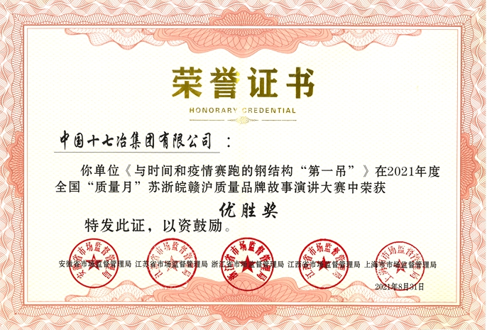 近日,江苏、浙江、安徽、江西、上海四省一市市场监管局联合组织开展的质量品牌故事演讲大赛结果揭晓,中国十七冶集团选送的作品《与时间和疫情赛跑的钢结构“第一吊”》荣获优胜奖。