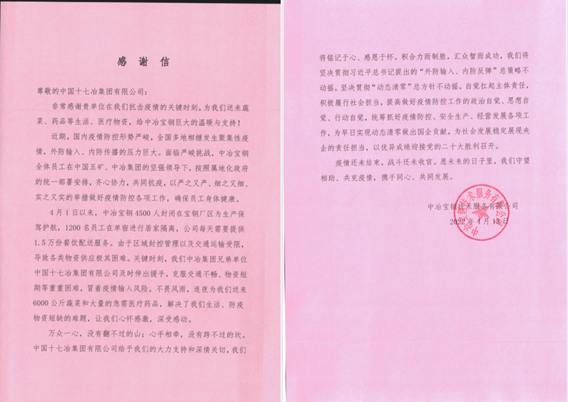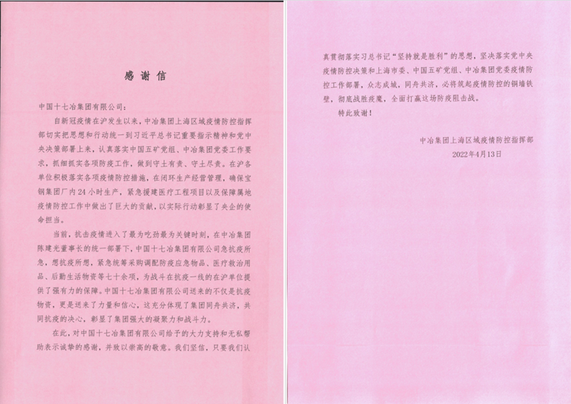 4月13日,中冶集团上海区域防疫指挥部、中冶宝钢技术服务有限公司向中国十七冶集团致感谢信,对公司快速驰援急需的防疫应急物品、医疗救援物品以及后勤生活物资表达了诚挚感谢。