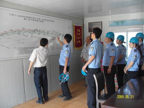 521下午,骄阳似火,南京市建邺区公安分局双闸派出所全体公安干警在教导员莫伟、所长周巧宝的率领下,来到十七冶南京滨江大道1.1标项目部观摩学习,并把滨江大道1.1标项目作为该所开展学习践行科学发展观的第一课堂。
