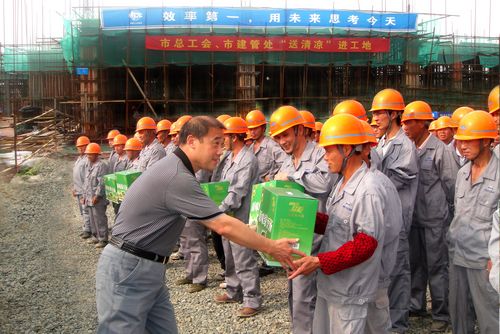 张宏展主席代表市总工会对大家挑战高温、坚守岗位、连续作战为确保安置房工程如期完工付出的辛勤劳动表示肯定,并叮嘱他们注意防暑降温,注意身体健康,相关部门要严格落实安全生产,合理安排作息时间,把安全放在第一位。