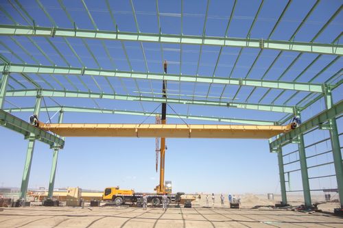 管加工车间设计长114米,宽60米,共两跨,跨距30米,屋脊高12.5米。设计行车两台,每台行车自重34.445吨,跨度28.5米,起重负荷10吨。新疆克拉玛依每年4至6月正值高温和大风强沙季节,施工区域四周是茫茫的隔壁滩,遇到大风时现场就掀起漫天黄沙,能见度不足50米。项目部及机装五处员工做好防风护沙的防护装备,克服高温和强沙带来的干扰,将精细化管理落实在现场实处,掀起大干30天的高潮,确保了设备的顺利吊装。