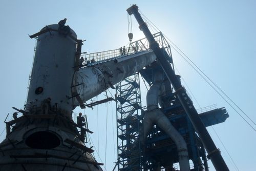 该下降管位于高炉西南侧,横跨西出铁场屋顶,直径3032mm,长44m,最低点标高42.72m,最高点标高达70.8m,重约62.5吨。冶金工程技术公司和项目部高度重视,精心编制施工方案,严格组织施工程序,利用电脑模拟验算,确定采用500吨汽车吊进行吊装。项目部克服了持续高温、吊装场地狭小、构件单体重量大等困难,一次性成功吊装,顺利完成该重大节点。高炉下降管的成功吊装,标志着该高炉炉体结构安装进入收尾阶段。