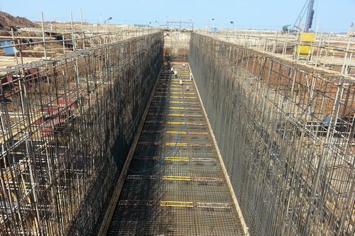 12月19日下午,湛江钢铁炼钢项目铁合金地下料仓底板一次性通过验收,开始浇筑混凝土。 铁合金地下料仓及通廊长134.50m,由料仓、通廊及转运站三部分组成,其中料仓长82.00m,宽7.60m,底标高-9.35m。因地处沿海,地下水位浅,受潮汐影响较为严重等因素限制,施工难度较大。为保证工期及工程质量,项目部采取深井降水与基坑三级放坡开挖相结合的施工方法,经过50天的艰苦奋战,地下料仓底板钢筋一次性通过宝钢监理、宝钢质监站的严格验收,混凝土开始浇筑。