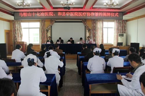 428,马鞍山十七冶医院与和县中医院医疗协作签约揭牌仪式在和县中医院举行。马鞍山市卫生局副局长潘春生、十七冶医院院长王仲恺、副院长苏仕功、和县中医院院长李长来出席签约揭牌仪式。