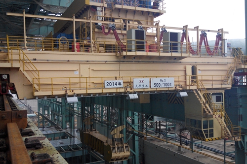 该行车安装于北区炼钢加料跨,由ABB设计,采用变频控制,进线电压为3KV,经一台主变和一台辅变变换成电压690V 为传动系统供电和电压380V为低压系统供电。在工期紧、任务重及持续的阴雨天气给行车调试工作带来的不利影响下,冶金工程技术公司充分发扬“高效严谨、精细务实”的企业作风,积极践行“24小时工作法”,保持“一天也不耽误、一天也不懈怠”工作状态,紧紧围绕“抓安全、管质量、保工期”的工作目标,组织精兵强将克服重重困难,仅用10天的时间圆满地完成了这一重大节点,为今后的转炉、过跨车等重要设备的吊装创造了便利条件。