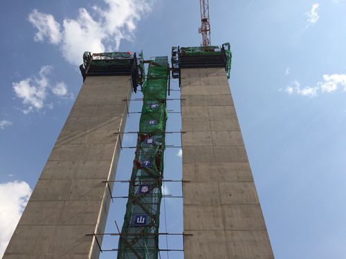 此次完成封顶的4#墩为变截面空心墩,墩身整体高度为53.71m,采用翻模施工工艺。首件空心薄壁墩的顺利浇筑为大桥其余空心薄壁墩混凝土的浇筑积累了宝贵经验。