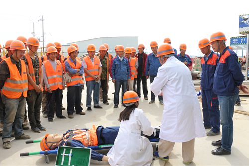 演练开始前,医护人员详细讲解了高处坠落事故发生的原因和安全预防措施。随着项目总工一声令下,救援人员迅速启动应急预案组织自救,医疗救护人员利用担架将受伤人员抬到事故现场外,同时立即停止现场所有高空施工作业,确保人员安全有序撤离现场,防止次生伤害发生。演练过程中,医护人员还示范对施工现场发生高空坠落的人模进行腿部包扎,让大家进一步掌握现场应急救援常识。