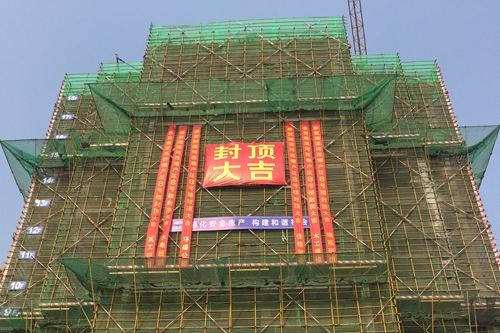 河西棚户区安置房工程位于濉溪县濉河西路与202省道交叉口西南角,总建筑面积82698.82㎡,其中地上建筑面积67040.52㎡,地下建筑面积15658.3㎡,共包含1栋整体车库、1栋人防、2栋2层商铺、5栋18层高层住宅、1栋20层高层住宅和2栋24层高层住宅。此次封顶的8#楼为18层钢筋混凝土剪力墙结构,建筑高度52.65m。