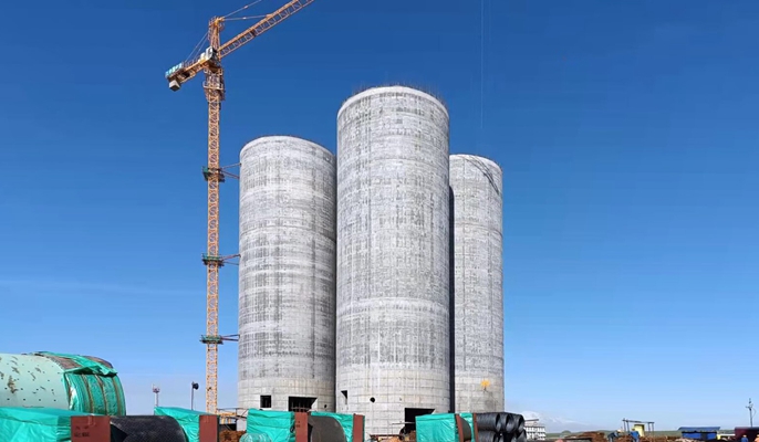 本工程位于塔什干州阿汉加兰区比尔力克村,分2个标段,一标段包含石灰石破碎、联合储库、生料库、熟料库、窑头、窑中和窑尾等子项。二标段包含磨房、水泥库、水泥包装、水泥调配、厂前区等子项。此次滑模的生料库工程高为56米,直径22.5米;水泥库工程由4个高54米,直径18米的水泥库组成。本工程是中国十七冶践行“一带一路”合作倡议的具体体现,建成后将为当地提供就业岗位、完善产业结构,促进经济发展具有重要作用。