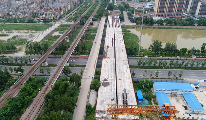崤函大道项目位于河南省三门峡市,全长11.96公里,红线宽度60米,为城市主干道,设计时速为50公里。中国十七冶承建长度为6.961公里,建设内容包含大桥四座、互通立交一座、匝道桥一座。此次贯通的青龙涧2号桥全长304米,全桥共9跨2联,33米T梁90片,桥梁依次跨越仰韶大道、青龙涧河、河堤北路。本项目是三门峡市“十四五”规划实施的一项基础性、关键性工程,对拉大三门峡城市框架、完善城市功能、建设生态宜居城市,推动经济社会转型发展具有关键性支撑作用。