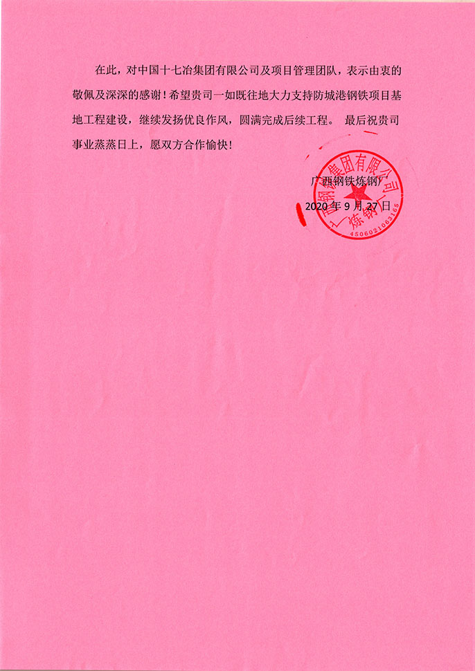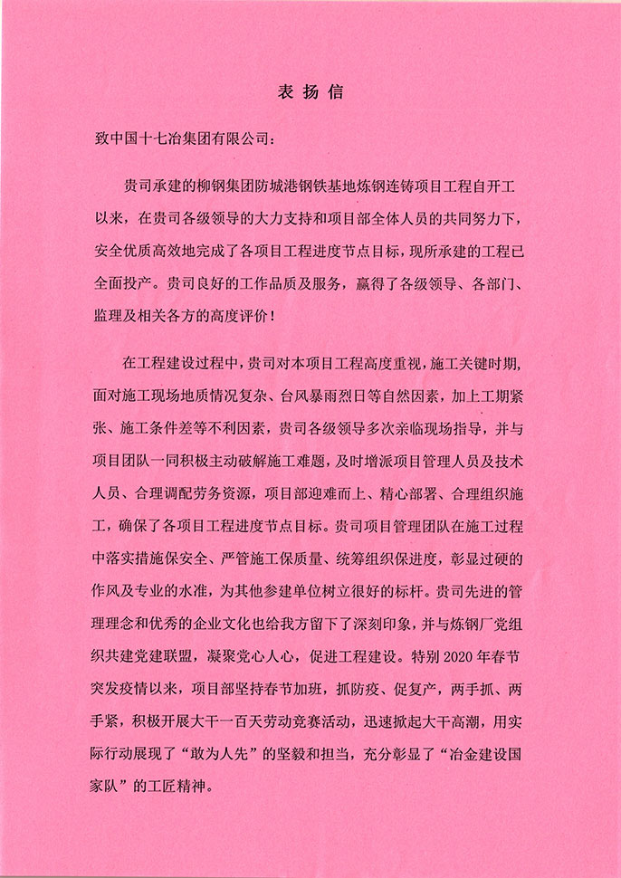 表扬信称,在工程建设过程中,面对施工现场地质情况复杂、台风暴雨烈日等自然因素,加上工期紧张、施工条件差等不利因素,防城港钢铁炼钢项目项目部积极主动破解施工难题,及时增派项目管理人员及技术人员、合理调配劳务资源,迎难而上、精心部署、合理组织施工,确保了各项目工程进度节点目标。特别2020年春节突发疫情以来,项目部坚持春节加班,抓防疫、促复产,两手抓、两手紧,积极开展大干一百天劳动竞赛活动,迅速掀起大干高潮,用实际行动展现了“敢为人先”的坚毅和担当,充分彰显了“冶金建设国家队”的工匠精神。希望一如既往地大力支持防城港钢铁项目基地工程建设,继续发扬优良作风,圆满完成后续工程。