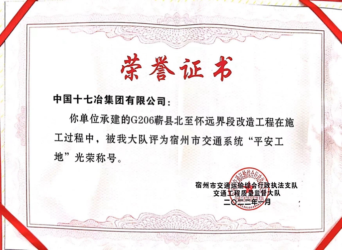 1月13日,中国十七冶集团路桥工程技术分公司G206蕲县北至怀远界段改造项目部荣获宿州市交通系统“平安工地”称号。