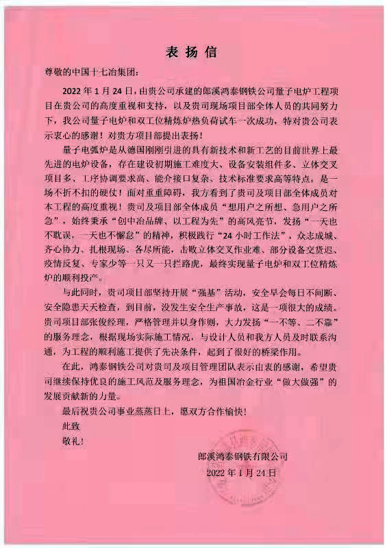 1月24日,鸿泰钢铁有限公司向中国十七冶集团致信,对冶金工程技术分公司承建的郎溪鸿泰钢铁公司量子电炉工程项目取得卓越成绩表示衷心的感谢,对项目部提出表扬。