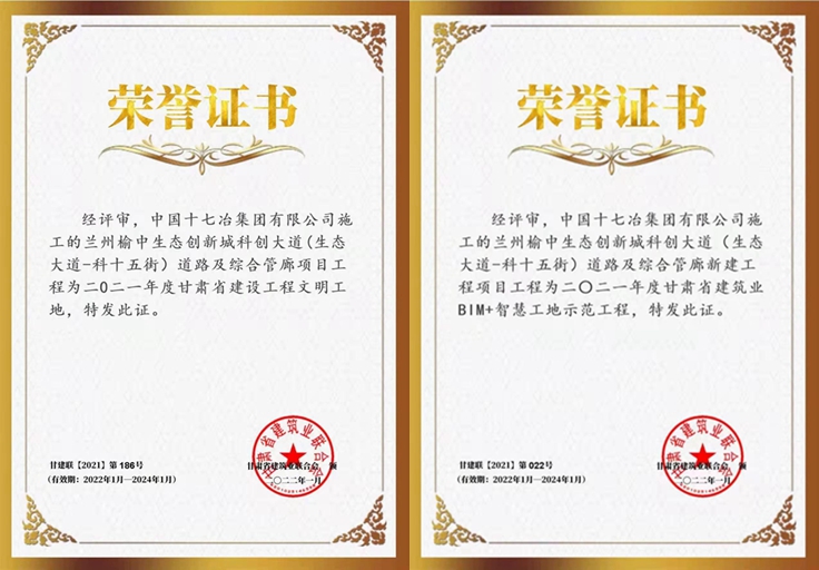 日前,中国十七冶集团公路工程技术分公司承建的兰州榆中生态创新城科创大道项目经理部荣获“2021年甘肃省文明工地”和“2021年BIM+智慧工地示范工程”称号。