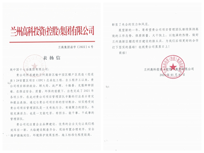 3月27日,兰州高科投资(控股)集团有限公司向中国十七冶集团发来表扬信,对中国十七冶集团甘肃分公司承建的榆中园区棚户区改造(经适房)2#安置区EPC总承包工程项目出色完成2021年各项工作给予充分肯定和高度赞扬。